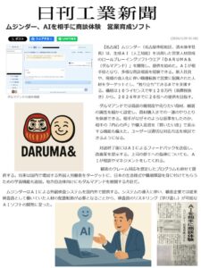 2026.02.01 お知らせ 日刊工業新聞に掲載されました。 2026年1月29日木曜日の日刊工業新聞に弊社記事が掲載されました。 AIを活用した営業員育成ロールプレイ及びクレーム対応ロールプレイの「DARUMA&」を紹介しております。